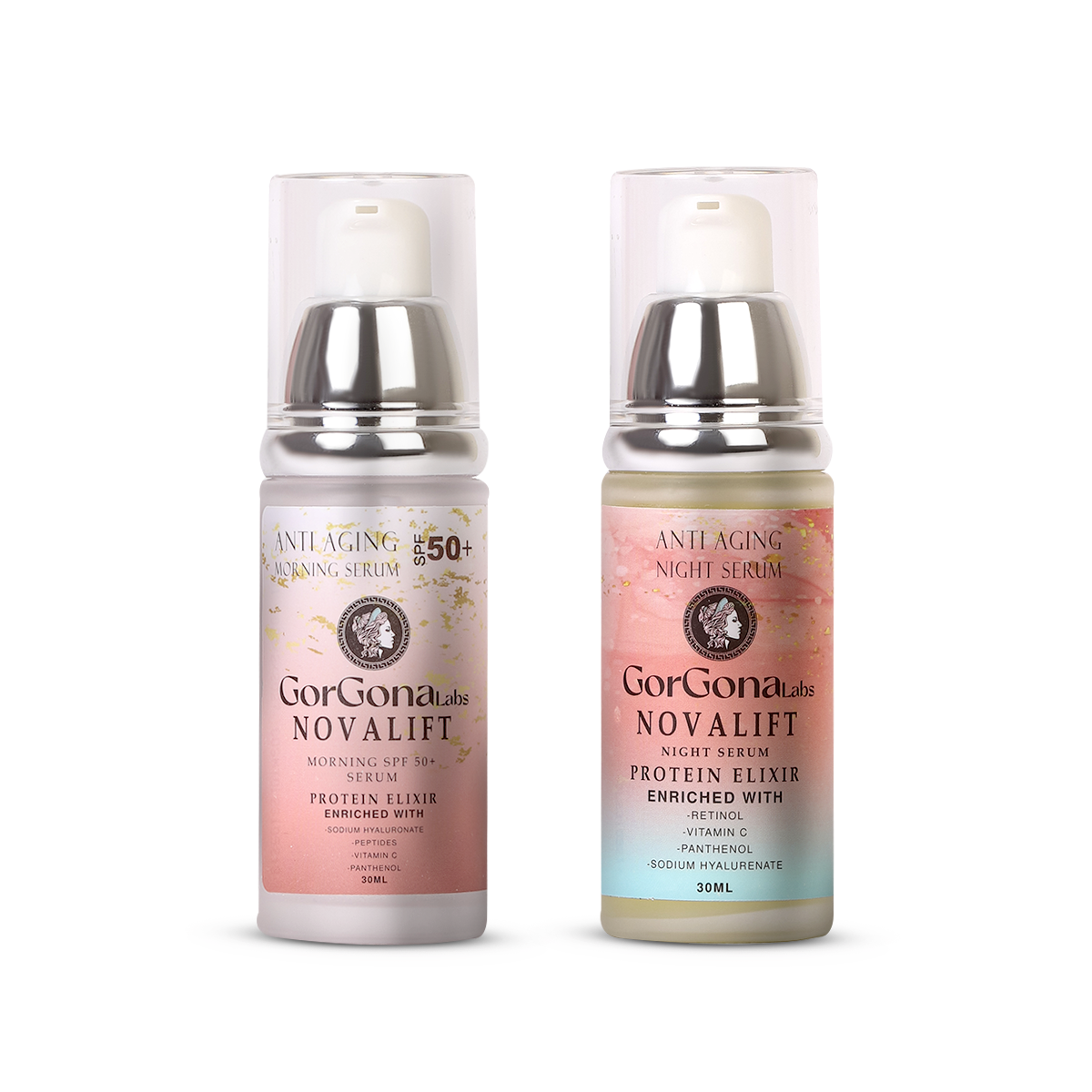 مجموعة ثنائية مصمّمة لتلبية احتياجات بشرتك على مدار اليوم، مورنينج سيروم + نايت سيروم.